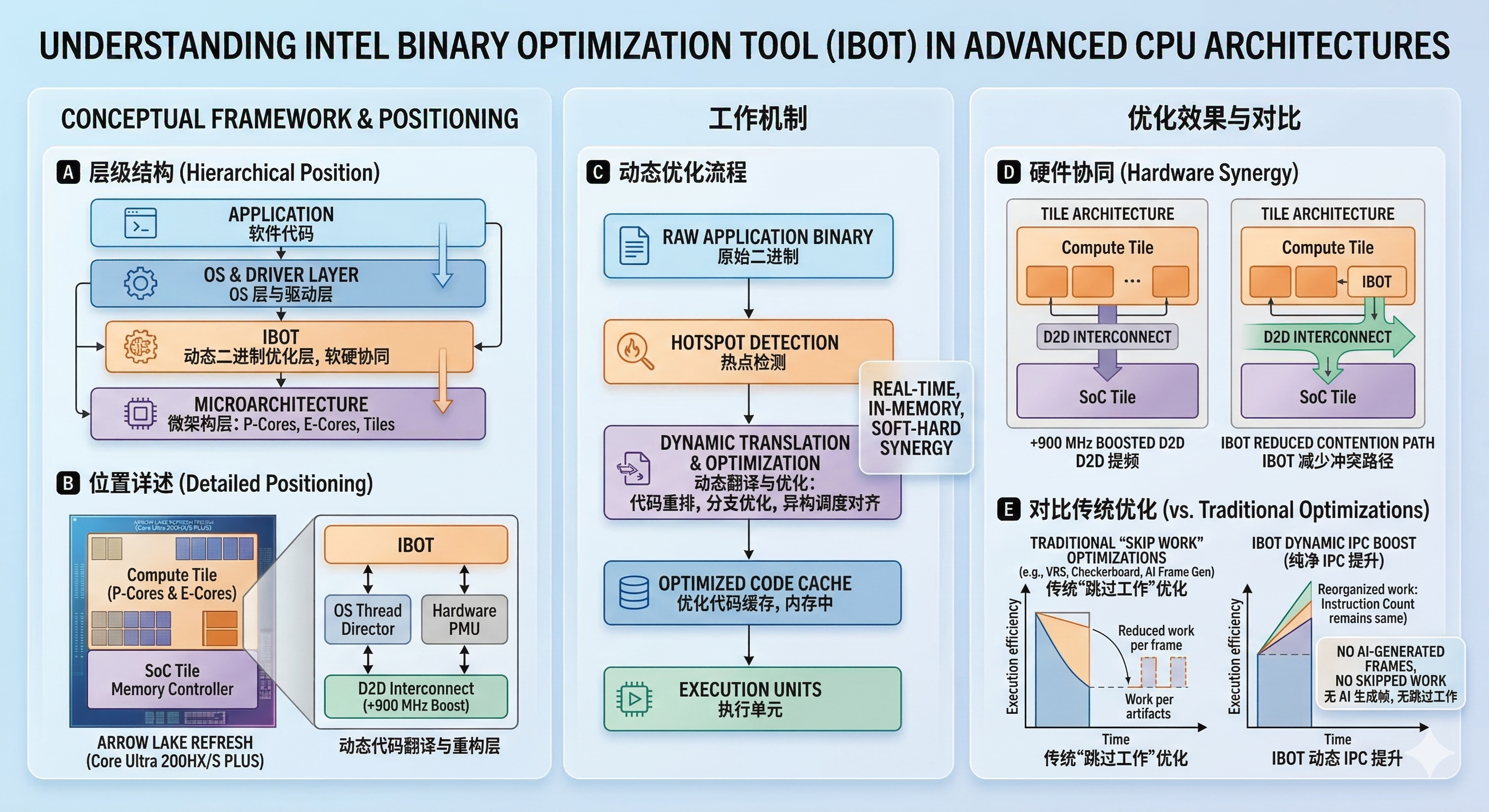 与传统的编译器优化是在程序运行前完成不同,IBOT 运行在系统底层,它实时监控应用程序的指令流,识别出那些执行效率低下的代码段,并针对 Arrow Lake 的微架构特性进行动态重写。